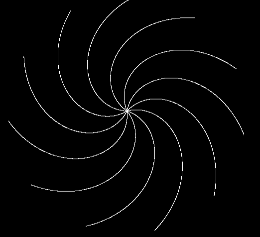 직선으로 뻗은 팔들을 휘게 만들어 소용돌이 모양을 만듭니다. 핵심 아이디어는 "중심에서 멀수록 더 많이 회전시킨다"입니다. radius값에 spin파라미터를 곱해 spinAngle을 구하고, 이를 branchAngle에 더해주면 간단하게 구혈할 수 있습니다.